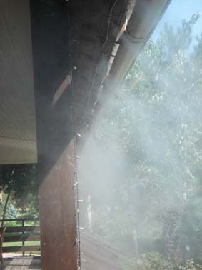 На открытой веранде ресторана лучшей на Ахтубе турбазы для рыбаков установлена быстромонтируемая бюджетная безвентиляторная система туманообразования и увлажнения воздуха типа "ИнтерФог-ТУМАН" с использованием пластиковых трубок и быстросъемных форсунок-адаптеров.